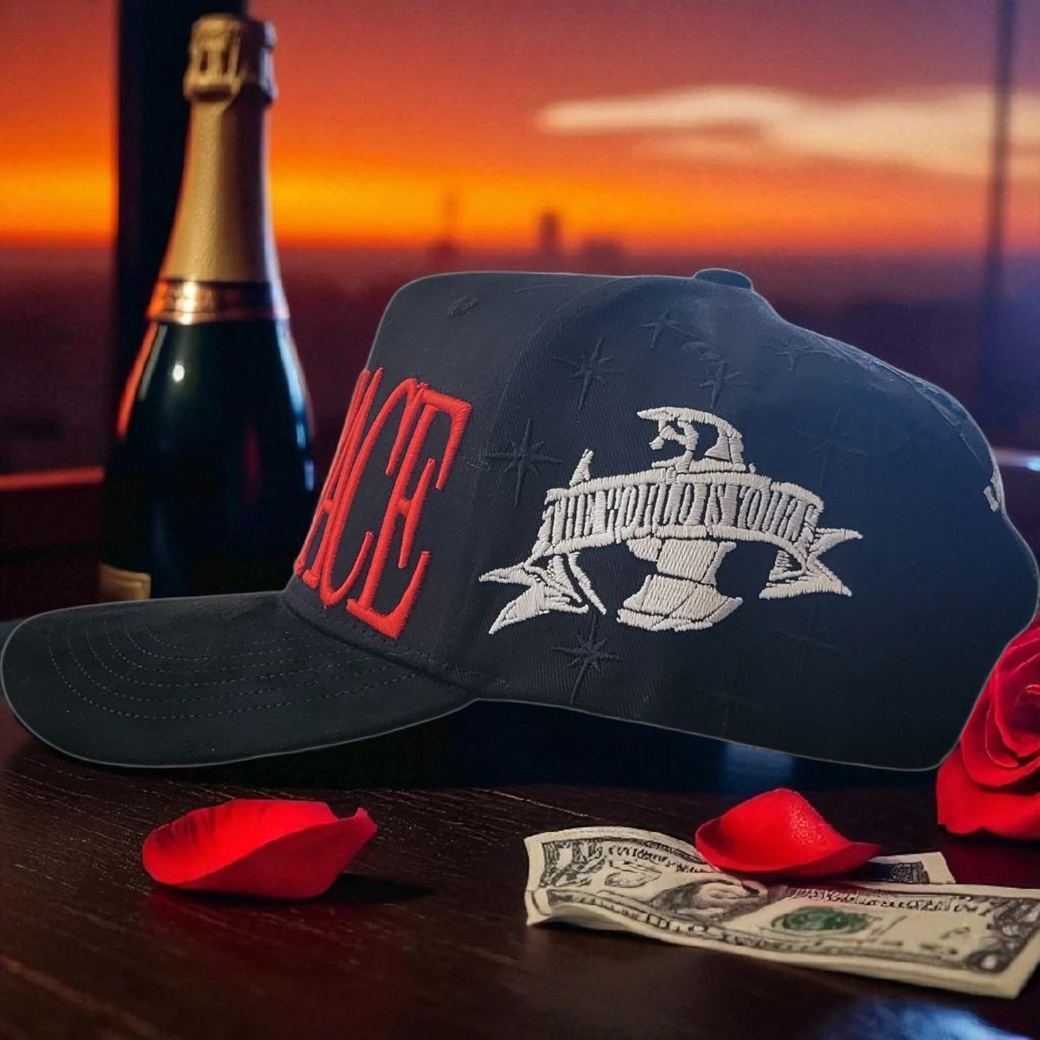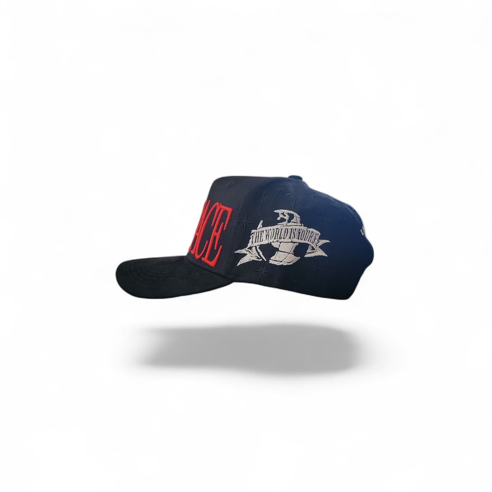 A un lado, el mundo se ilustra con la frase "The World Is Yours", recordándote que los límites solo existen si los pones tú mismo. En el otro lado, un mensaje impactante te inspira a seguir tus sueños. La parte trasera de la gorra está adornada con varias frases en blanco, rodeadas de estrellas negras que añaden un toque de sofisticación y carácter.